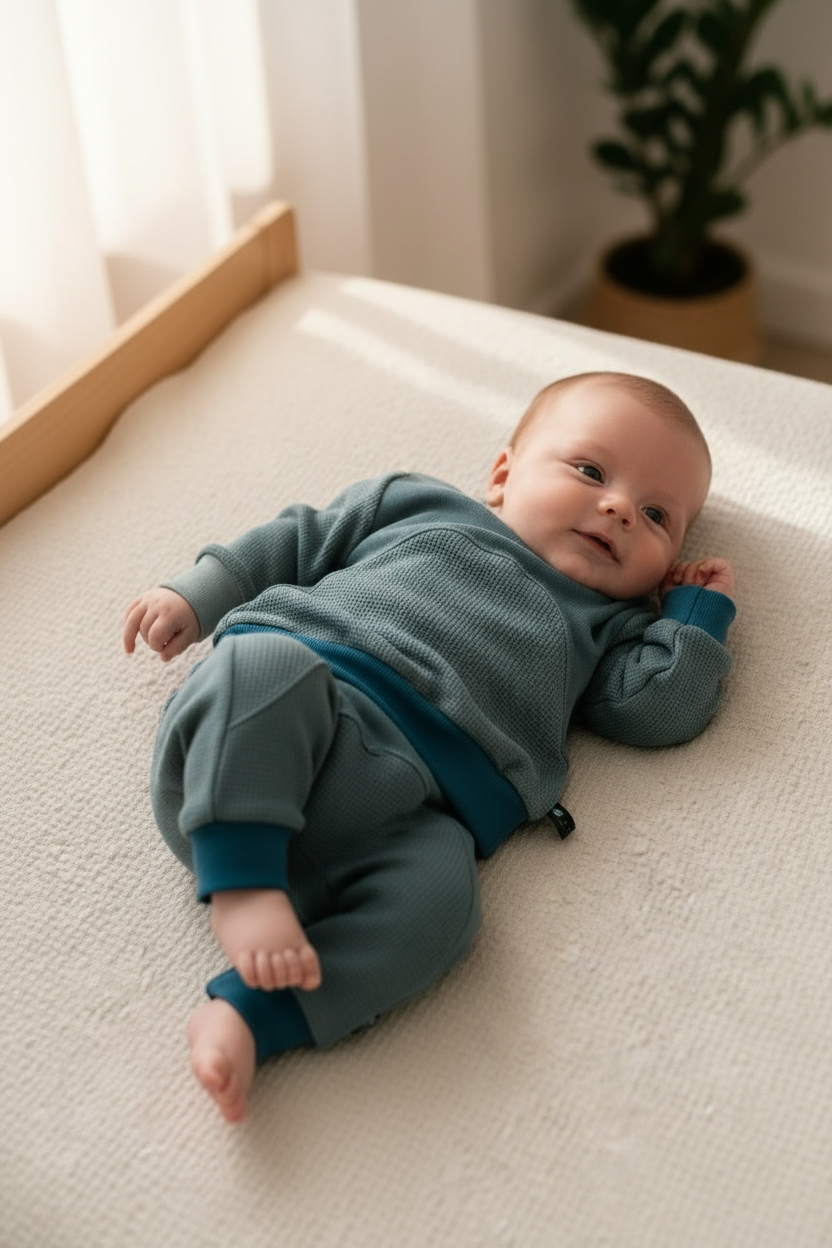 This sweater is wonderfully warm for winter. It matches harem pants of the same name. Made partly of polycotton, partly of double waffle knit. Both are in vintage green and both are Oekotex organic certified. The cuffs are petrol blue and mint green.