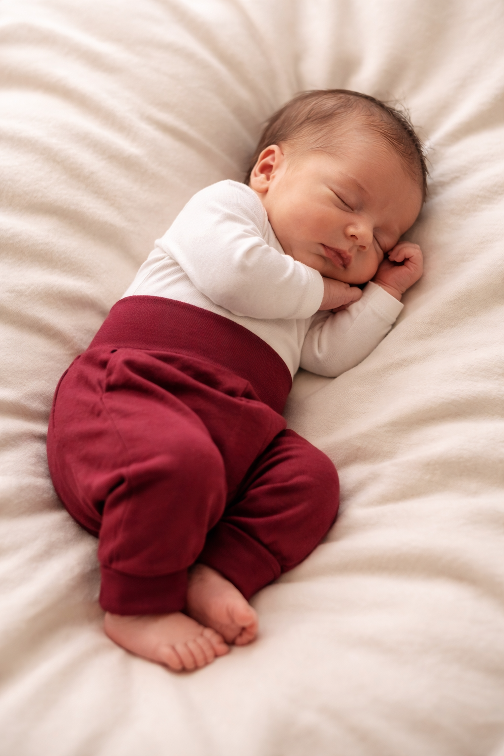 De zachte tailleboord van boordstof houdt het broekje goed op zijn plek zonder elastiek of druk op het buikje. Dankzij de lange, oprolbare enkelboorden groeit het broekje mee met je kindje.