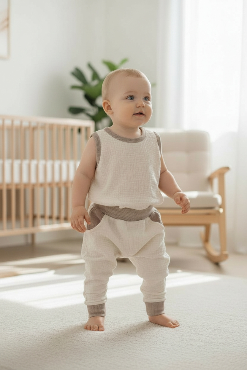 Omdat hydrofiel katoen geen stretch heeft, is dit broekje voorzien van een rekbaar inzetstuk van ribtricot in het kruis. Dit zorgt voor extra bewegingsvrijheid en comfort tijdens kruipen, spelen en ontdekken. De zachte tailleboord van boordstof sluit prettig aan zonder elastiek of druk op het buikje.