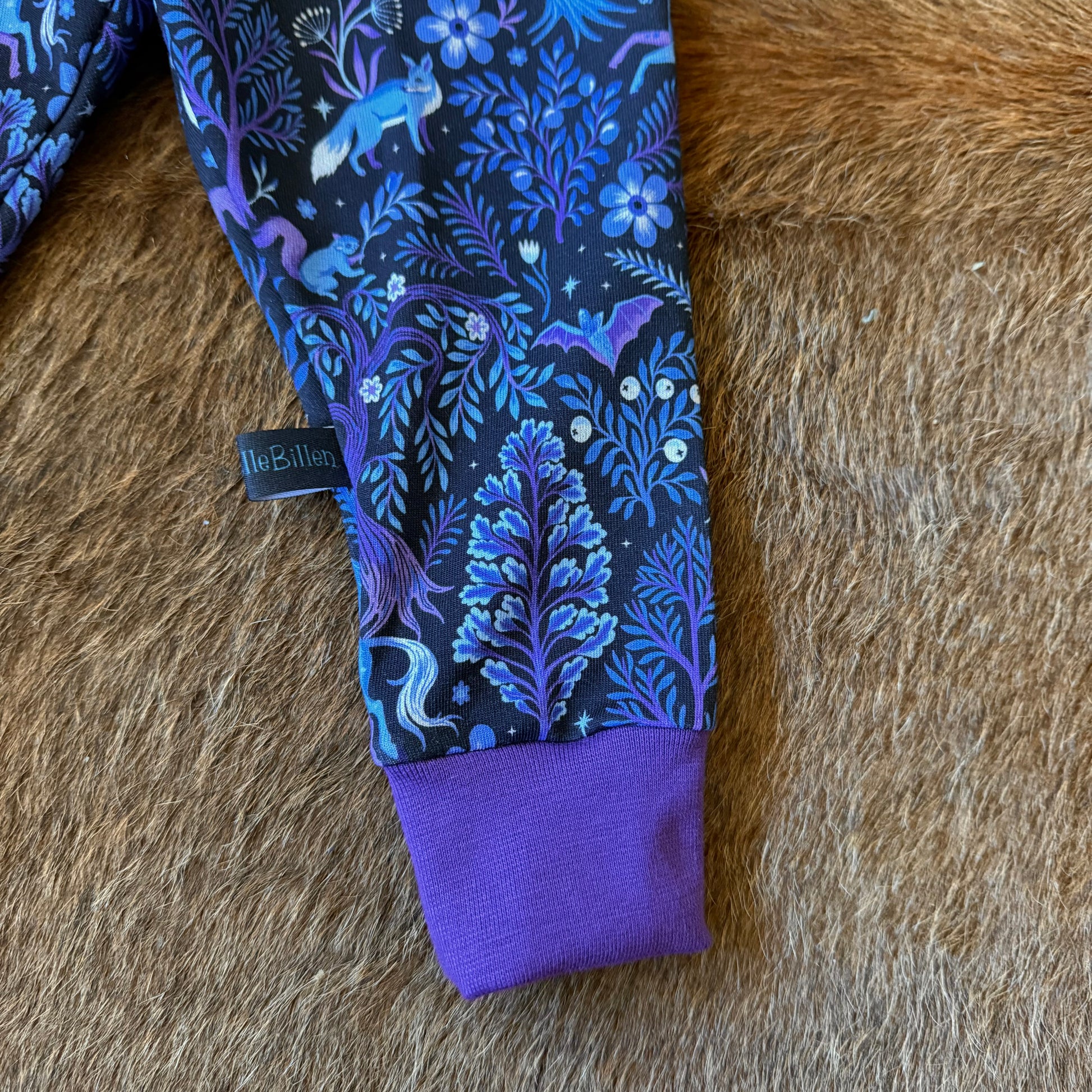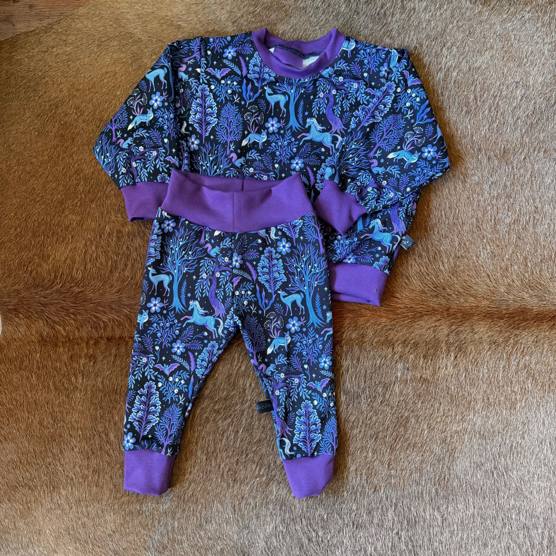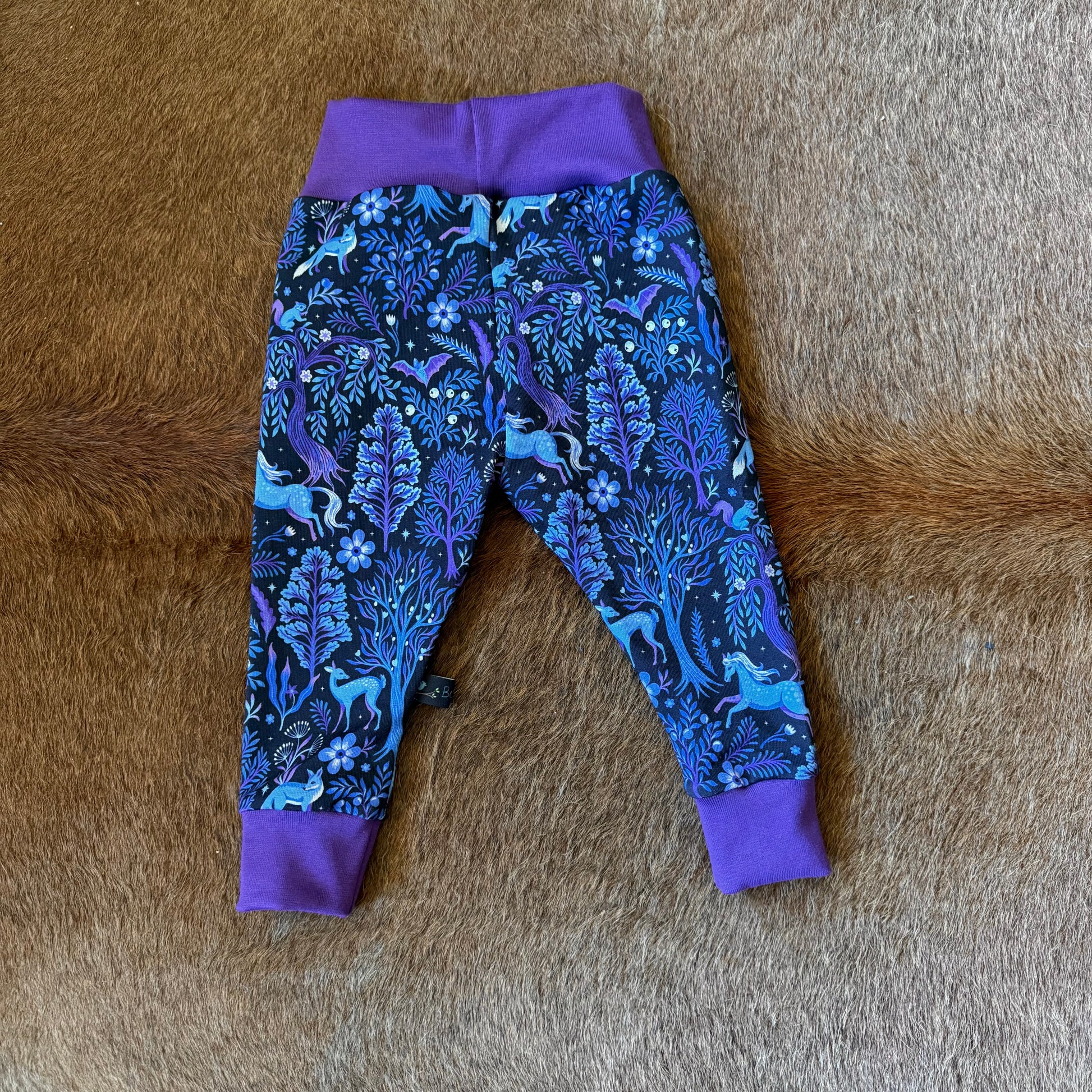 Heerlijk hetfstbroekje dat perfect past over wasbare luiers. Gemaakt van bio-katoen french terry in paars en blauw. De boordjes zijn paars.