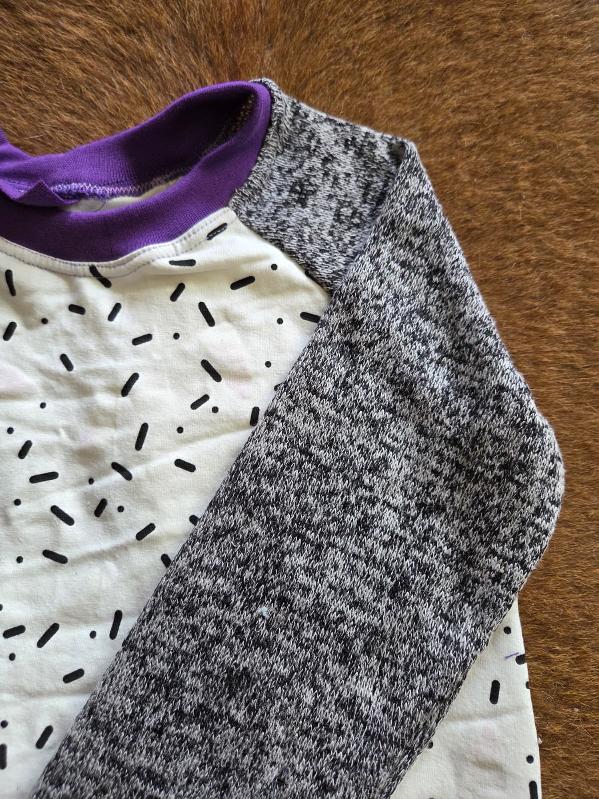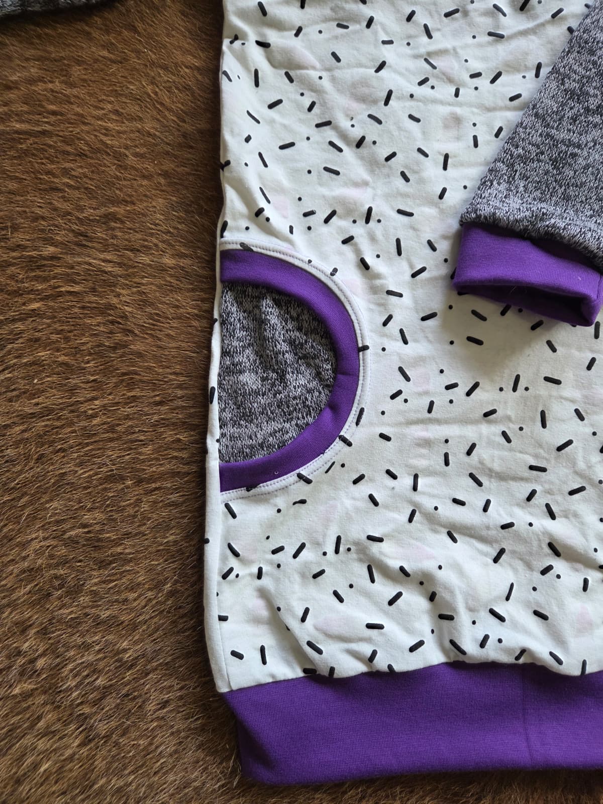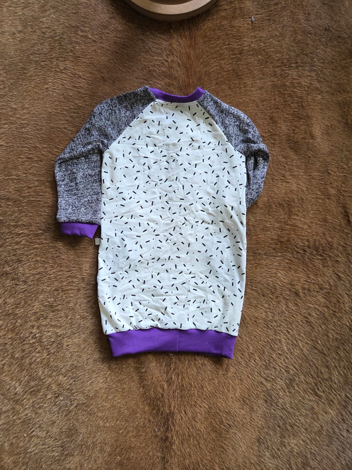 Gemaakt van zachte katoen tricot die comfortabel en soepel valt. De mouwen en nepzakjes zijn uitgevoerd in een gemêleerde grijze Oeko-Tex knit katoen, wat het jurkje een speels contrast geeft. De paarse boordjes zorgen voor een vrolijke afwerking.